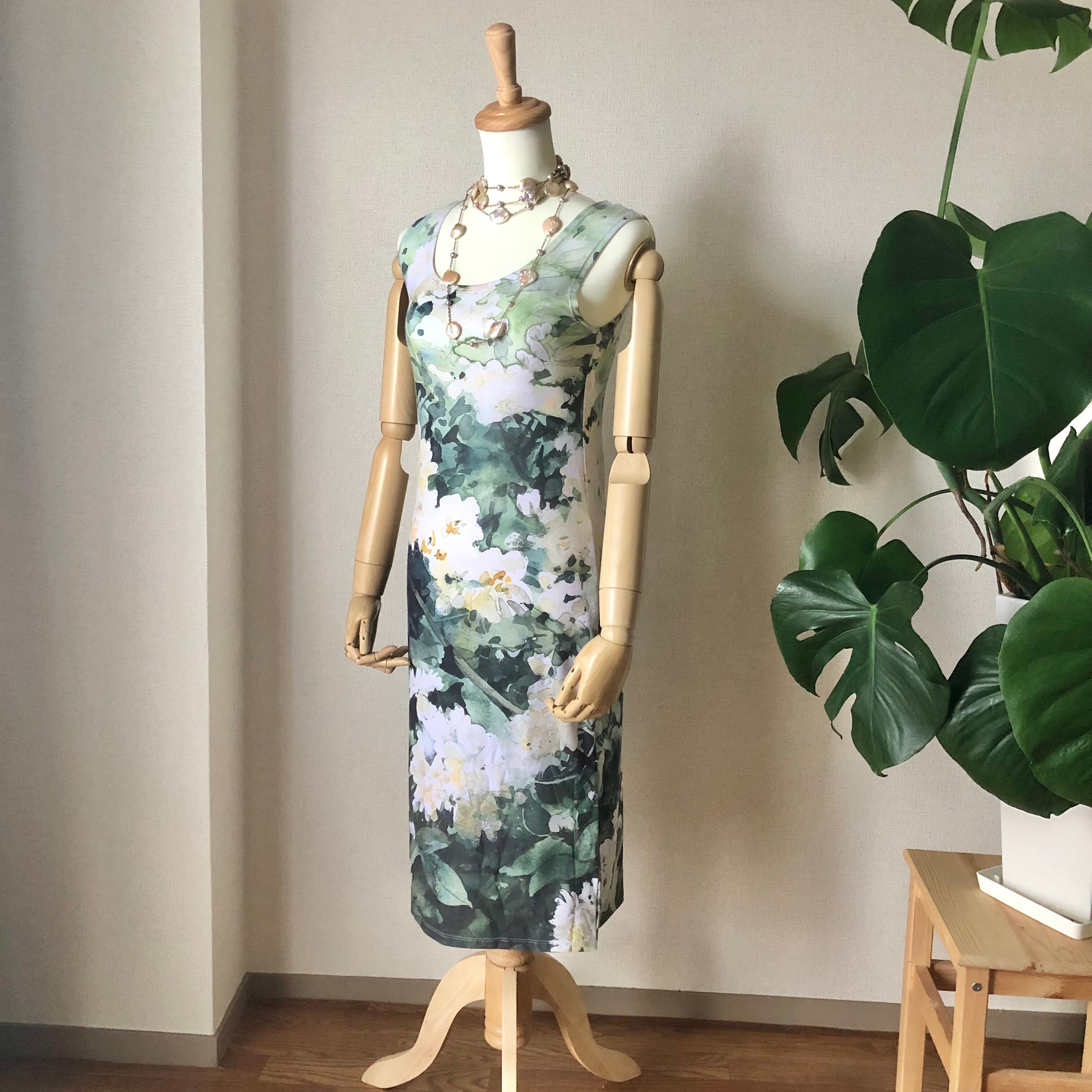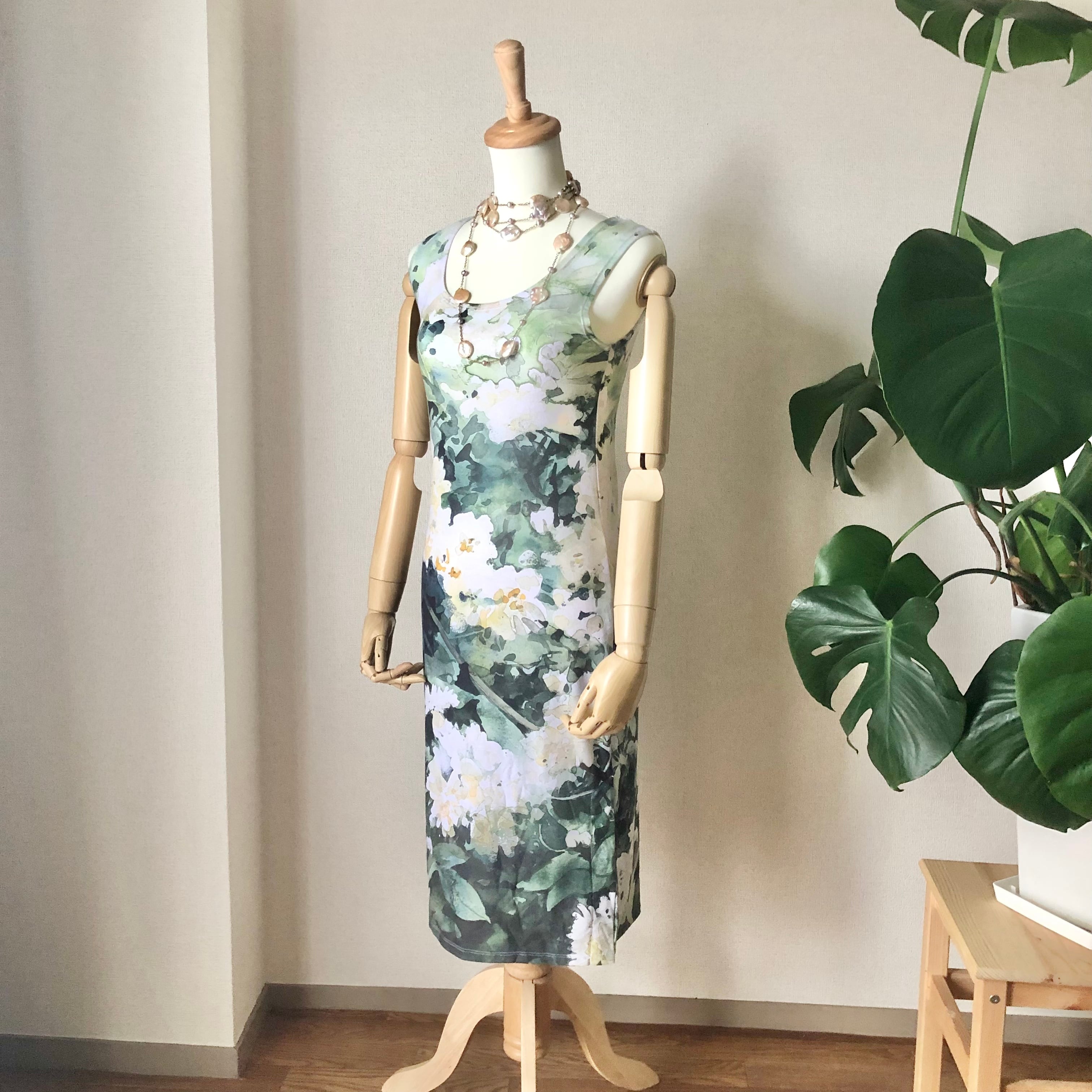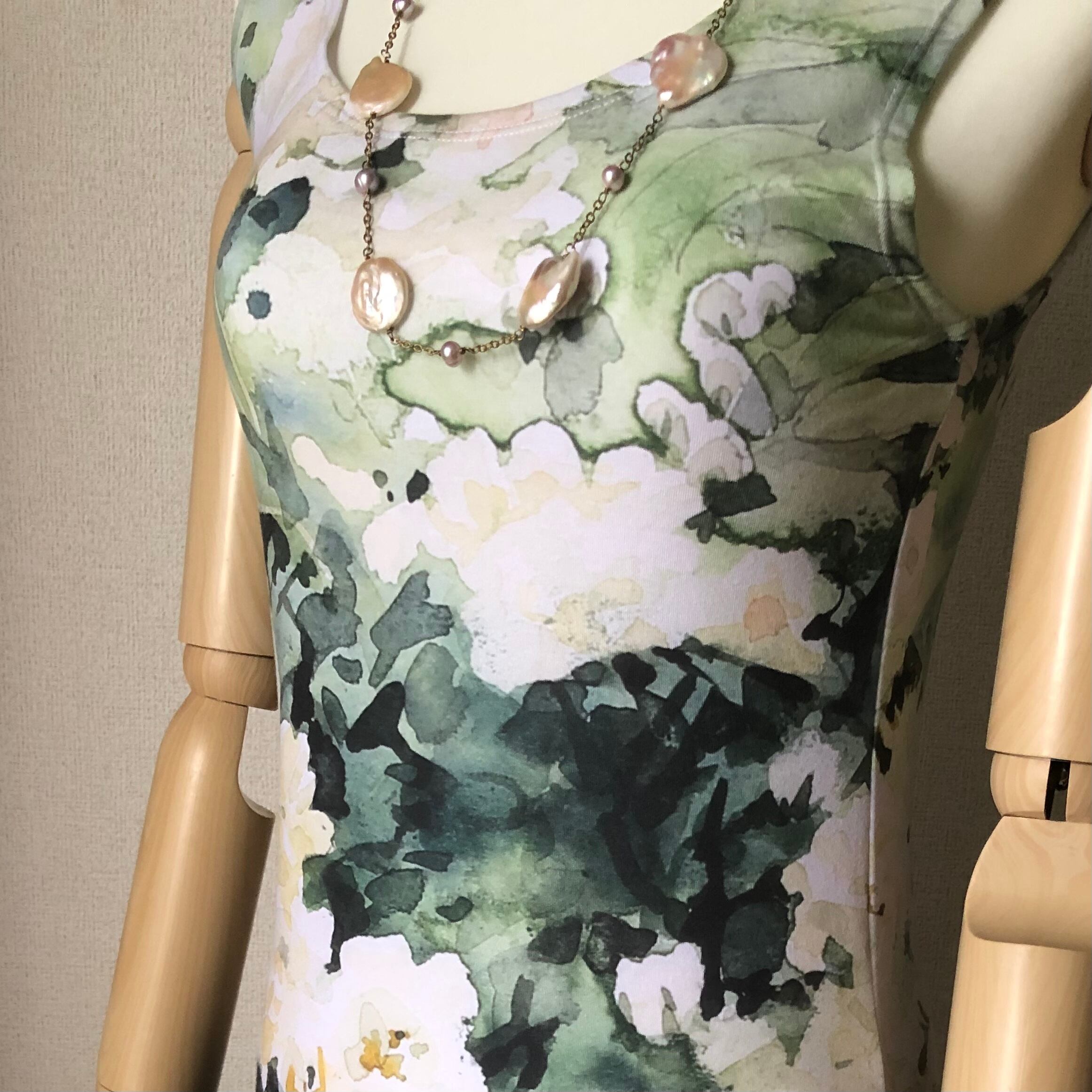 水彩の絵柄(白いモッコウバラ)がプリントされたワンピースの提案です。